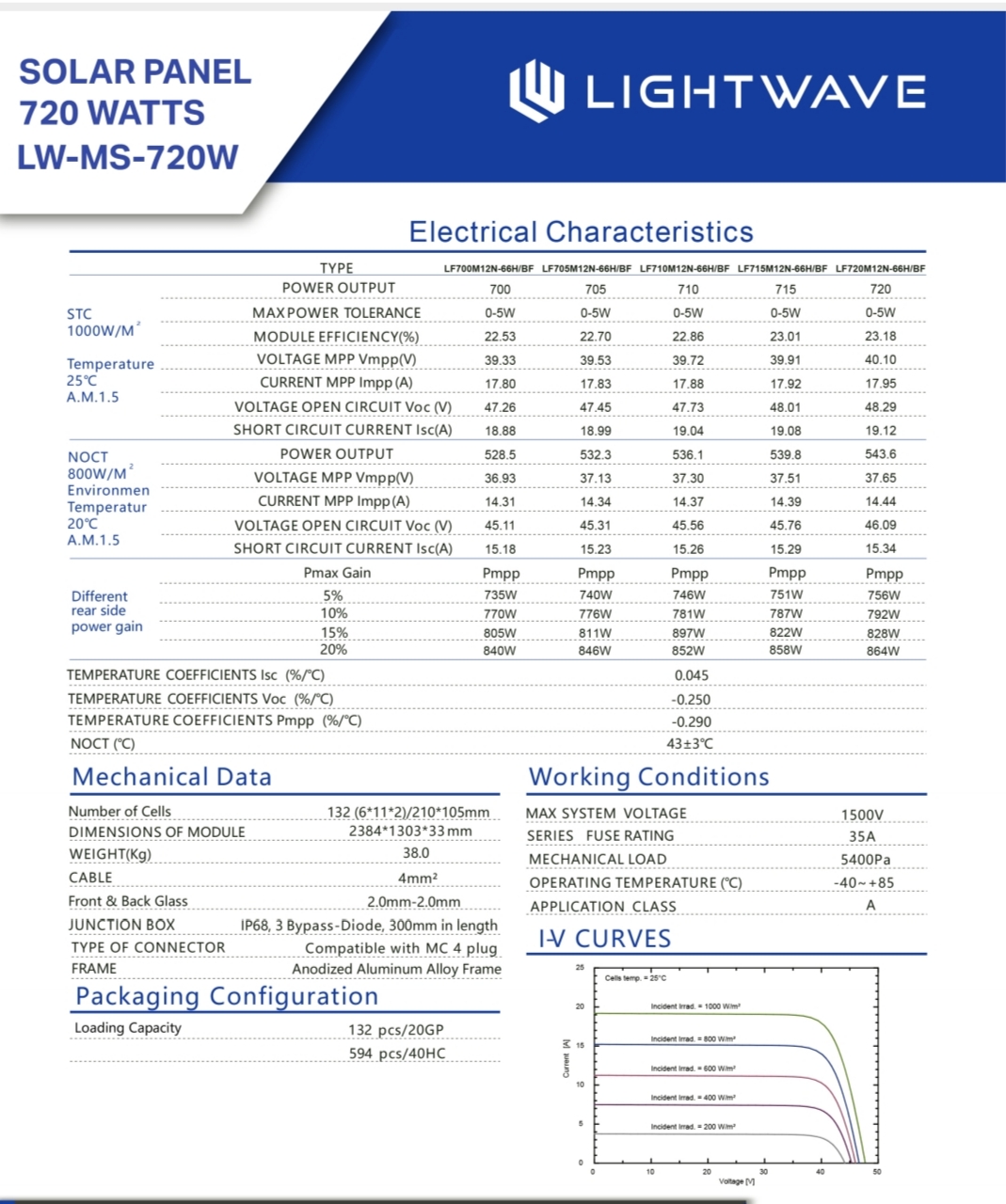 پنل خورشیدی ۷۲۰ وات بایفشیال دو طرفه (لایت ویو)